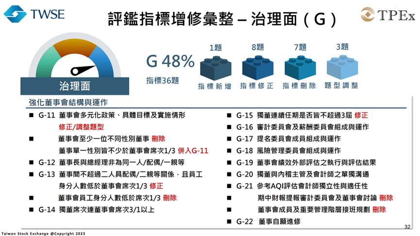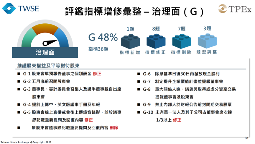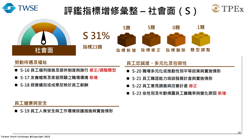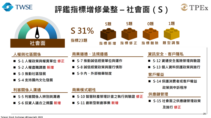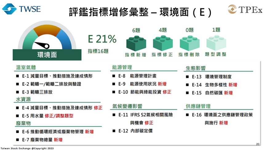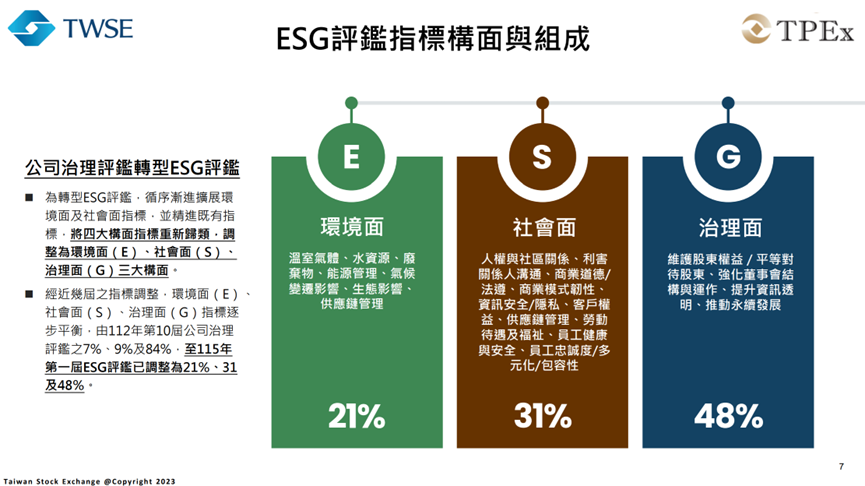 「ESG 評鑑」新制度將從過去以治理為中心的架構,轉換成更完整的「環境、社會、治理」三大面向,總計共有75項具體指標,其中據報導為「新增 12 項、修正 17 項、刪除 7 項、並調整 5 項題型」,而在主題比重的分配約是環境面占21%、社會面占31%、治理面占48%。雖然治理仍然是重要部分,但環境與社會的比重將大幅提升,讓評鑑成為真正的企業「永續全身健康檢查」。